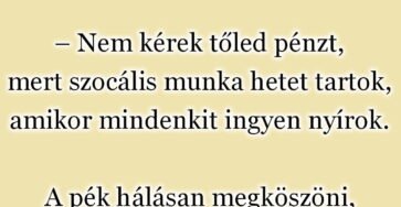 Elmegy a pék a fodrászhoz,a fodrász le is vágja a haját,ám amikor fizetne, így szól: – Nem kérek tőled pénzt,mert…