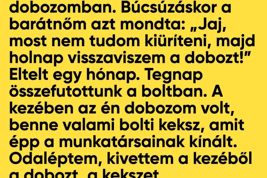 – Köszönöm, hogy megőrizted, Zsuzsa! – mondtam. – Már azt hittem, elveszett. Látom, használtad is. A kekszet edd meg egészséggel, de a doboz jön velem haza. Legközelebb zacskóban viszem a sütit, az nem ragad a kezedhez.
