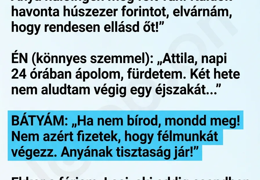 A bátyám a szememre vetette, hogy „kosz van” a beteg édesanyánk körül, miközben ő havonta egyszer jön látogatni – a férjem ekkor elővett egy húszezrest, és olyat tett, hogy a bátyám köpni-nyelni nem tudott