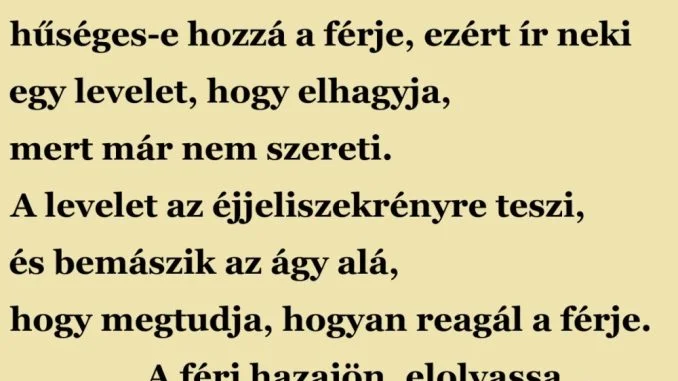 A levelet az éjjeliszekrényre teszi, és bemászik az ágy alá, hogy megtudja, hogyan reagál a férje.