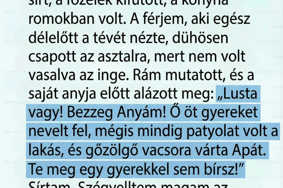 És ekkor jött a tőrdöfés. – Nézz rá Anyámra! – mutatott a mellette ülő, 70 éves, csendes asszonyra. – Ő öt gyereket nevelt fel! Ötöt! Mégis mindig volt tiszta ingem, a padlóról enni lehetett, és amikor Apám hazajött a földekről, meleg vacsora várta. Soha nem panaszkodott! Te meg egyetlen gyerekkel sem bírsz el? Lusta vagy, édes lányom, ez az igazság.