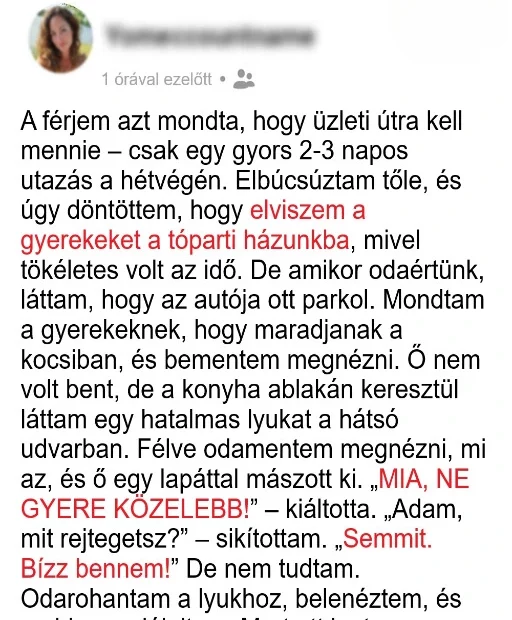 Mia azt hitte, férje, Ádám, munkaügyben utazott, ezért meglepetésként elvitte gyerekeiket a családi tóparti házhoz.