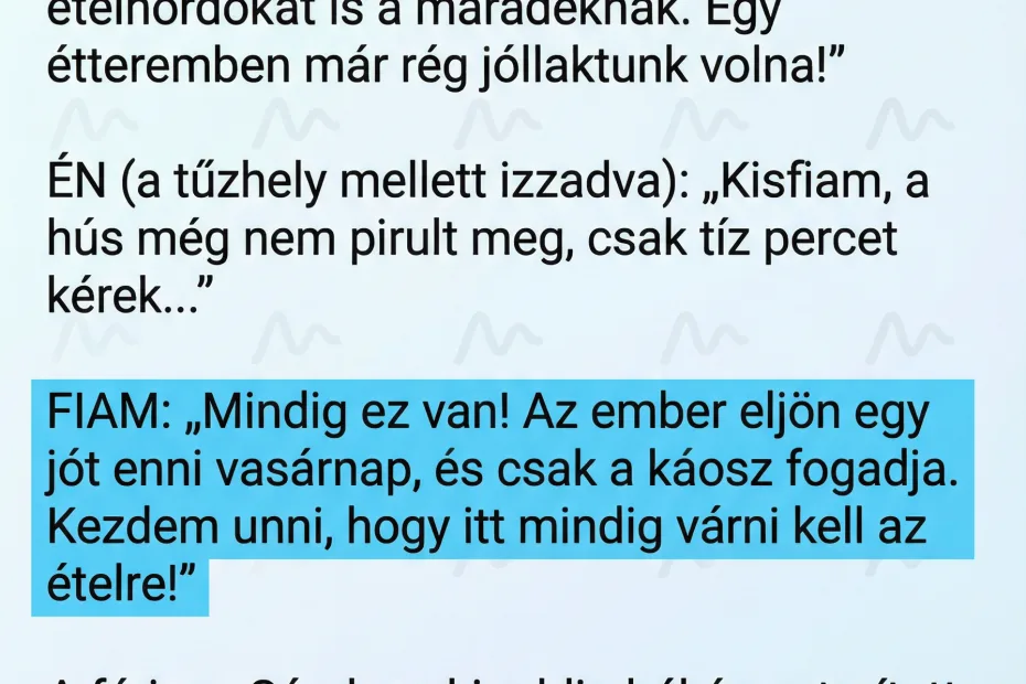 Szégyenkezve hajoltam a sütő fölé. – Kisfiam, a hús még nem pirult meg rendesen, csak tíz percet kérek, és tálalok – mondtam fáradtan. Norbi felcsattant. – Mindig ez van! Az ember eljön egy jót enni vasárnap, és csak a káosz fogadja. Kezdem unni, hogy itt mindig várni kell az ételre! – mondta arrogánsan, miközben a menyem egyetértően bólogatott.