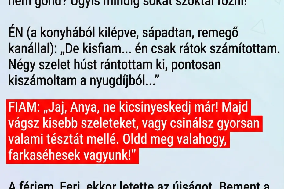 Délben csöngettek. Kitártam az ajtót, mosolyogva, de a mosoly az arcomra fagyott. Nem ketten voltak. Peti mögött ott álltak a menyem szülei, és még egy másik házaspár is, akiket alig ismertem. Összesen nyolcan. – Sziasztok! – harsogta Peti vidáman. – Hoztam egy kis társaságot! Épp erre jártunk anyósomékkal meg a haverokkal, és gondoltuk, beugrunk. Mindenki farkaséhes! Ugye nem gond? Anyám úgyis mindig sokat szokott főzni!