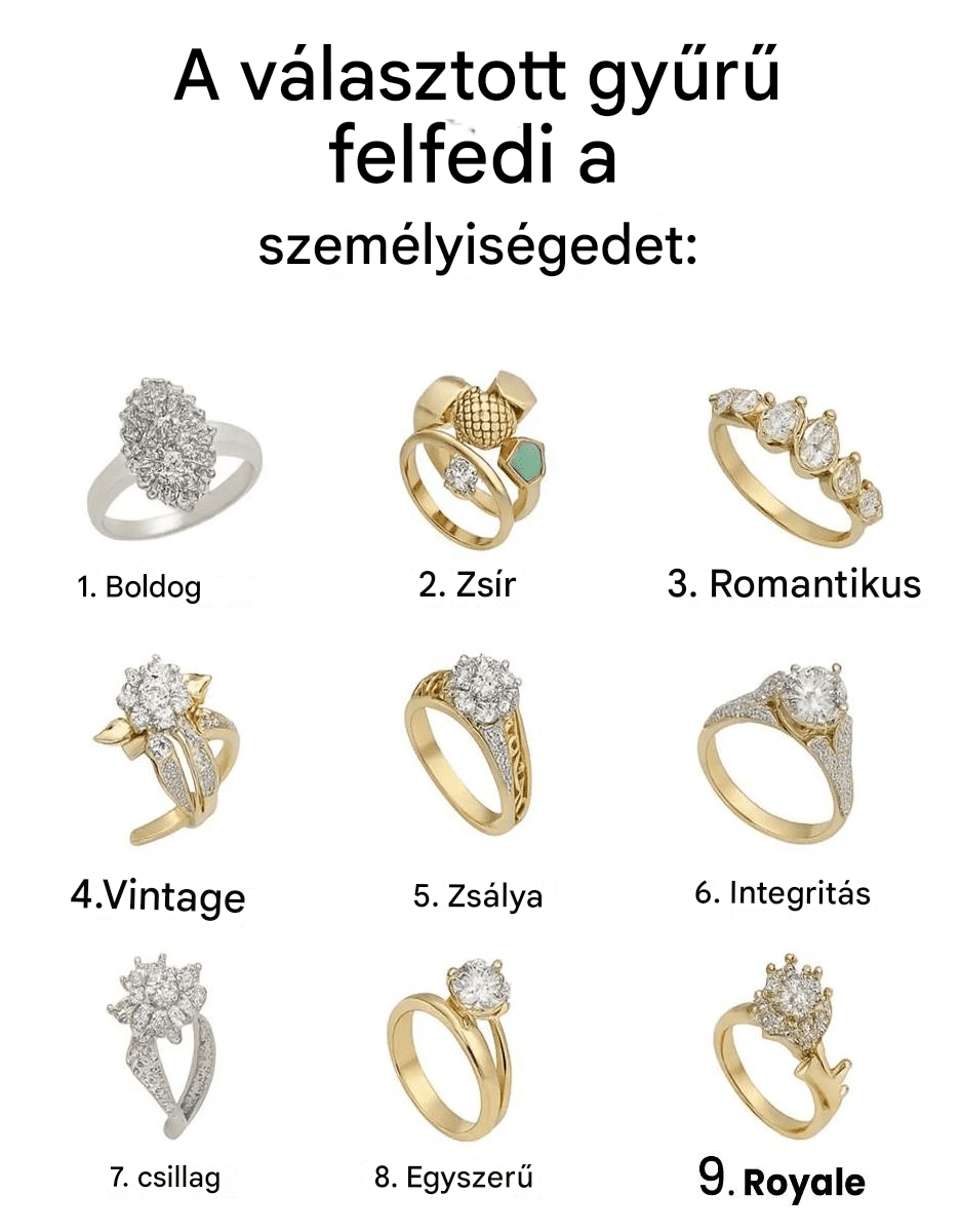 Észrevetted már, hogy egyes gyűrűk különleges módon vonzanak, mintha ismernék a legmélyebb titkodat? Mi van, ha ez nem véletlen? Minden gyűrű egy történetet mesél – a szíved, az energiád és a szereteted módjának történetét. Melyik lehet a tiéd ebből a kilenc gyűrűből?A fürtös gyémántgyűrű – Az elegáns látnok.