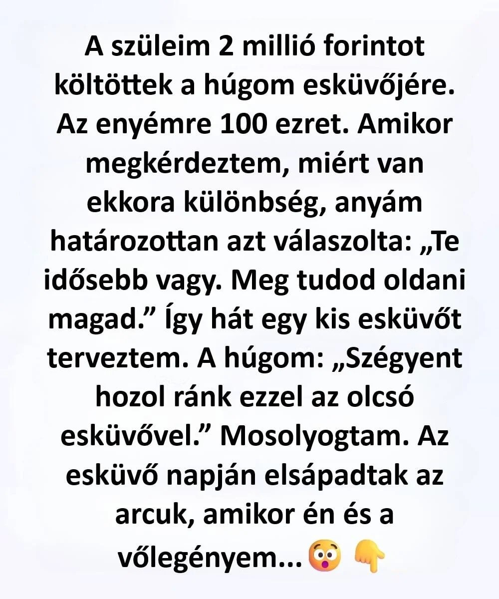 Nem kérdezgettem miért, nem irigykedtem, egészen addig, amíg rám került a sor. Nekem 2 ezer dollárt nyújtottak át, és anyám félvállról annyit mondott: „Nem vagy már olyan fiatal, megoldod.” Valami csendben átfordult bennem. Nem veszekedtem, nem duzzogtam. Nyugalmat választottam, egy kicsi, szívből jövő esküvőt terveztem, elvárások nélkül.