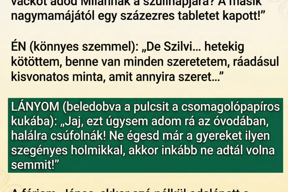 Az unokám, Milán, most lett hatéves. A férjemmel, Jánossal szerény nyugdíjból élünk, nem tudunk versenyezni a másik nagyszülőkkel, akik tehetős vállalkozók, és minden ünnepre drága, márkás játékokkal halmozzák el a kisfiút. De én úgy gondoltam, a szeretetet nem forintban mérik. Milán imádja a vonatokat. Két hónapon át, minden este, amikor már fájt az ízület az ujjaimban, akkor is kötöttem neki egy piros, finom fonalból készült pulóvert, aminek az elején egy bonyolult, szépen kidolgozott gőzmozdony pöfékelt. Minden öltésben ott volt a szívem.