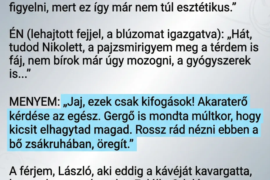 A 60. születésnapomat ünnepeltük. A férjem, László, a kedvenc éttermembe foglalt asztalt, és meghívtuk a fiunkat, Gergőt, és a feleségét, Nikolettet. Én hetek óta készültem. Vettem egy új, csinos, sötétkék ruhát, ami ápol és eltakar, voltam fodrásznál. Tudom, hogy az elmúlt években felszaladt pár kiló – a változókor, a pajzsmirigyproblémák és a kopott térdem miatt már nem megy úgy a mozgás, mint régen. De aznap szépnek éreztem magam.
