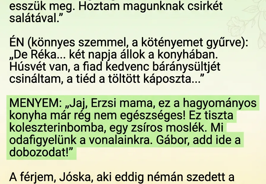 Húsvét vasárnapja volt. A férjemmel, Jóskával, számunkra az ünnep mindig a családról és a közös étkezésről szól. Bár a nyugdíjunkból nem könnyű kigazdálkodni egy nagy lakomát, hetekkel előtte spóroltam, hogy a fiaméknak a legjobbat tehessem az asztalra. Péntek óta a konyhában álltam. Megsütöttem a hatlapost, megfőztem a sonkát, elkészítettem a fiam, Gábor kedvenc báránysültjét, és külön a menyemnek, Rékának a töltött káposztát, mert tudtam, hogy szereti. Hulla fáradt voltam, mire megérkeztek, de a szépen megterített asztal látványa kárpótolt.