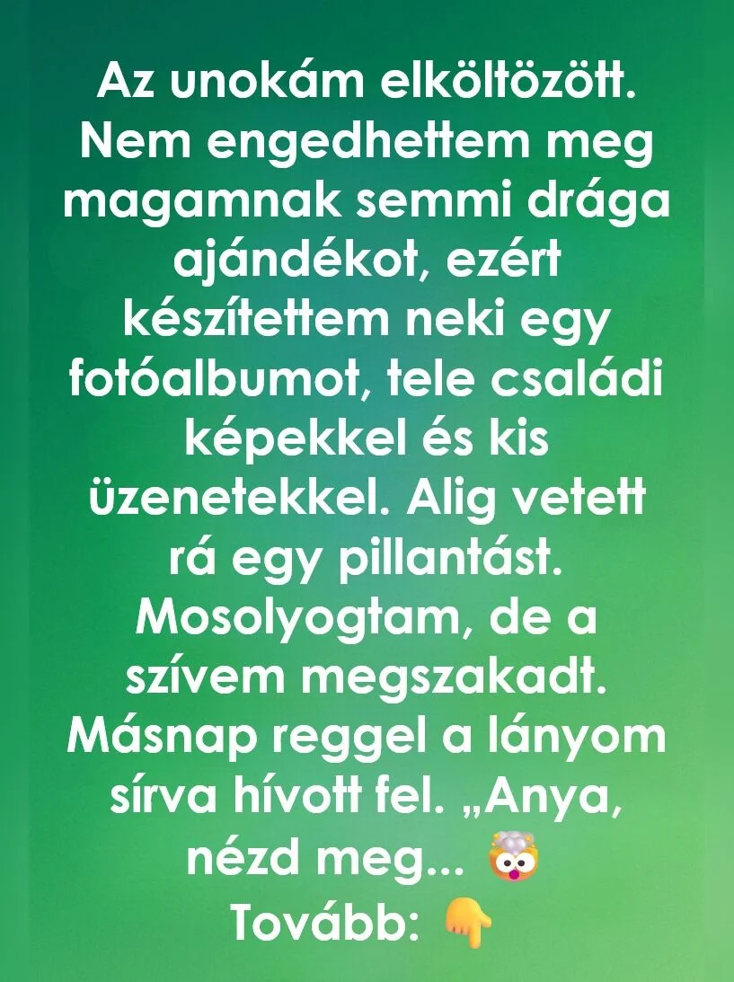 A költözés napján átadtam neki az albumot. Futólag belenézett, ránézett a borítóra, motyogott egy gyors „Köszönöm, Nagyi”-t, aztán már folytatta is a pakolást. Erőltettem egy mosolyt, hogy ne lássa, mennyire fájt ez a kis közönyös reakció. Aznap este egyedül ültem a csendes házban, és azon gondolkodtam, számít-e neki egyáltalán ez az album, vagy csak egy újabb jel volt számára, hogy az élete új szakaszában már alig marad hely számomra.