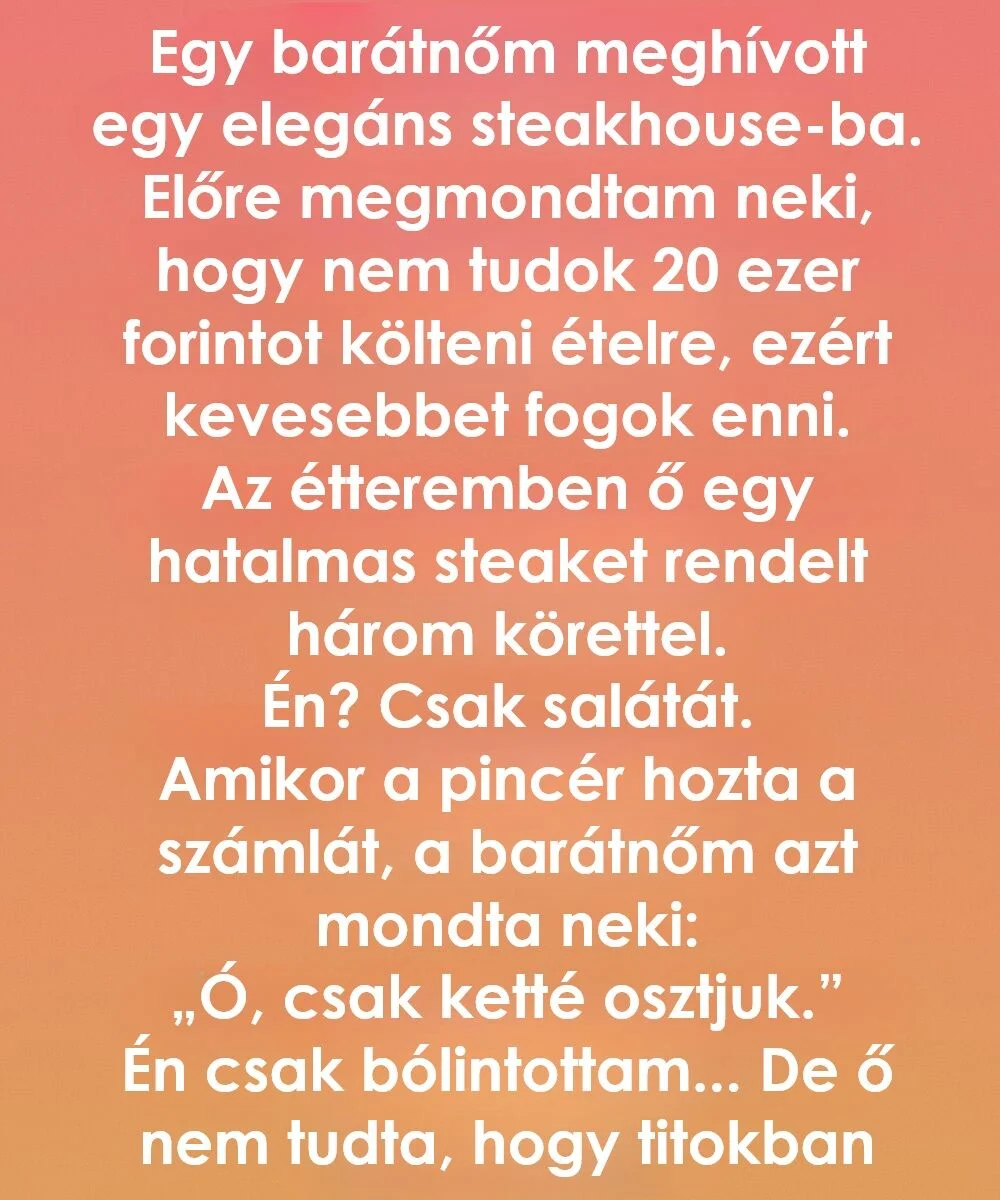Amikor megérkezett a számla, könnyedén odaszólt, hogy osszuk el ketten. Kedvesen bólintottam, de azt még nem tudta, hogy előkészítettem a helyzetet.