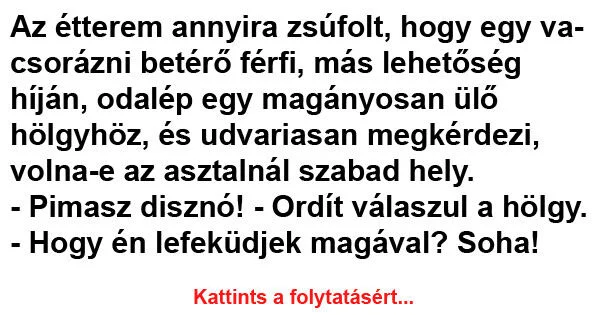 Az étterem annyira zsúfolt, hogy egy vacsorázni betérő férfi, más lehetőség híján, odalép egy magányosan ülő hölgyhöz, és udvariasan megkérdezi, volna-e az asztalnál szabad hely.