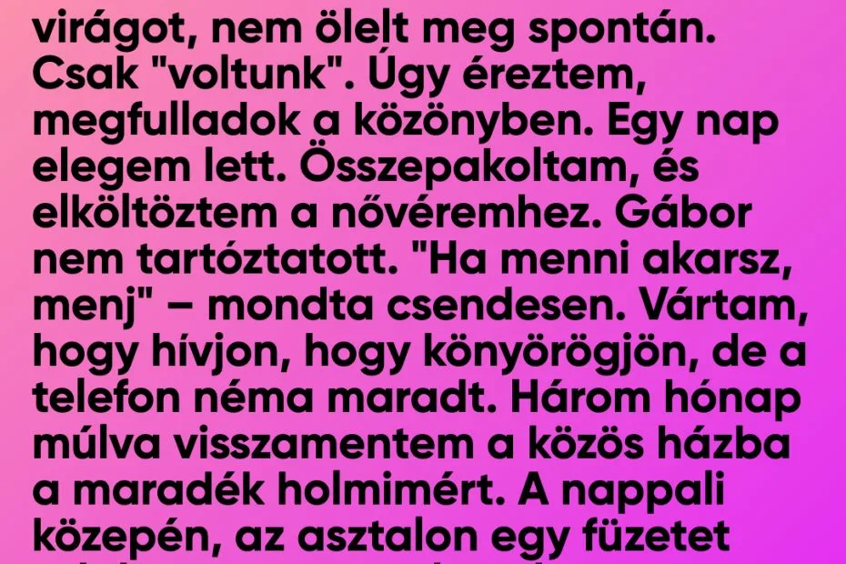 Gábor nem közönyös volt. Hanem gátlásos. Képtelen volt kifejezni az érzelmeit szóban vagy tettekben, mert gyerekkorában az apja kinevette, ha sírt vagy érzékeny volt. A szeretetét ebbe a füzetbe zárta. Minden elszalasztott ölelés, minden ki nem mondott dicséret ott volt a papíron, gyönyörű, fájdalmas rímekben. Szeretett. Jobban, mint bárki valaha. Csak nem tudta, hogyan mutassa ki.