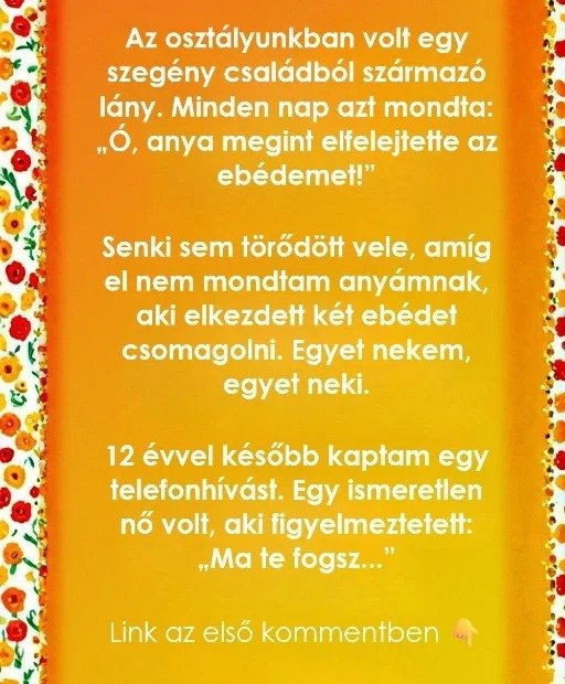Este elmondtam anyának, mi történik. Másnap két uzsonnát csomagolt: egyet nekem, egyet arra az esetre, ha valakinek szüksége lenne rá. Ettől kezdve ez lett a közös, kimondatlan szokásunk. Oda csúsztattam neki az extra ebédet, és együtt ettünk. Lassan többet beszélt, többet nevetett, és ezek a megosztott ebédek lettek a napunk legszebb pillanatai.