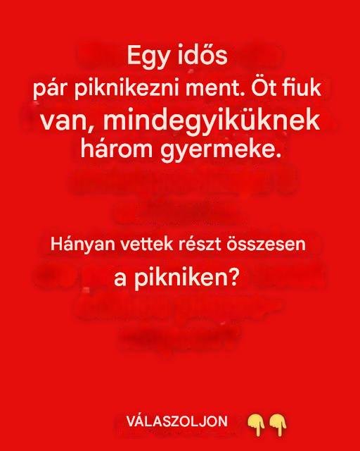 Ez a találós kérdés igazi közösségi média sláger. Látszólag egyszerű jellemzőket mutat be, kiegészítve egy számítással: „Egy idős pár piknikezik. Öt fiuk van, akiknek mindegyikének három gyermeke van. Hányan voltak összesen a pikniken?” Egy olyan kérdés, amely, bár látszólag ártalmatlan, sok internetfelhasználót késztetett arra, hogy feltegye ezt a kérdést.