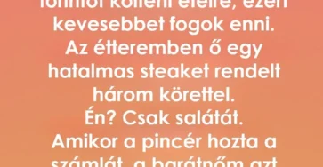 Egy barátnőm meghívott egy elegáns steak étterembe. Előre szóltam neki, hogy nem tudok 20 ezer fotintot elkölteni egy vacsorára, ezért…