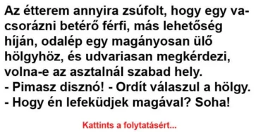 Az étterem annyira zsúfolt, hogy egy vacsorázni betérő férfi, más lehetőség híján, odalép egy magányosan ülő hölgyhöz, és udvariasan megkérdezi,…