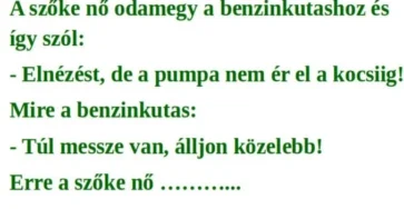 A szőke nő odamegy a benzinkutashoz és így szól: – Elnézést, de a pumpa nem ér el a kocsiig! Mire…