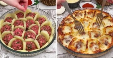 A burgonyát felszeletelte, tálba tette, rátette a húsgombócokat, meglocsolta a szósszal és megszórta a sajttal, már mehet is a sütőbe!