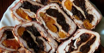Őzgerinc formában sült aszalt szilvás, barackos pulykamell baconbe tekerve