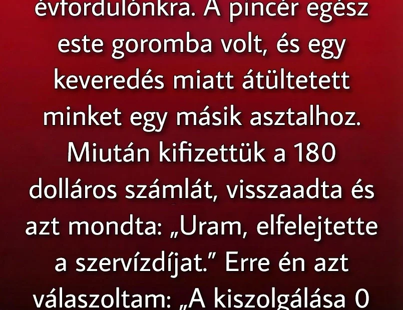 Egy gondosan megtervezett, meghitt vacsorát a pincér lekezelő viselkedése és egy megalázó megjegyzés tette kellemetlenné, ami végül teljesen megtörte az este hangulatát. Nem a pénz, hanem a tisztelet hiánya miatt álltam ki magamért, csendesen, jelenet nélkül. Másnap az étterem vezetője bocsánatot kért, és rájöttem: a méltóság sokszor többet ér, mint egy tökéletesnek hitt este.