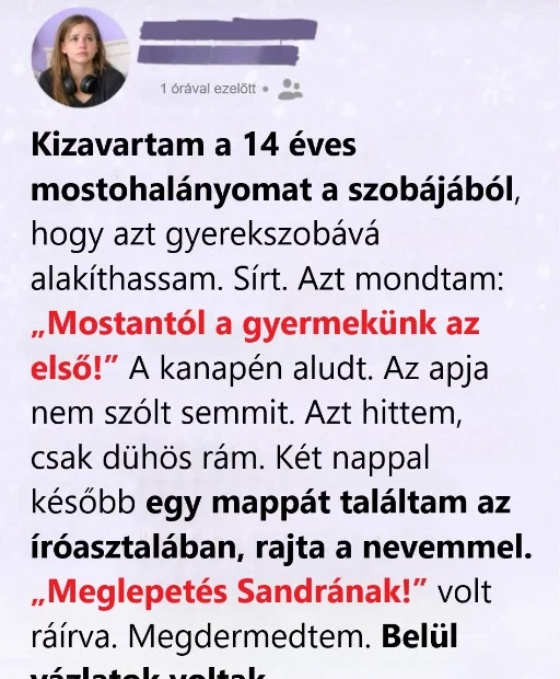 Öt hónapos terhes állapotomban döntöttem úgy, hogy a nevelt lányom szobáját alakítom át a babaszobává. Nem akartam körültekintően megvitatni, csak álltam az ajtóban, csípőre tett kézzel, és néztem a levendulaszín falakat, a gondosan berendezett ágyat. Aztán, mintha már rég lezártuk volna a kérdést, kijelentettem: