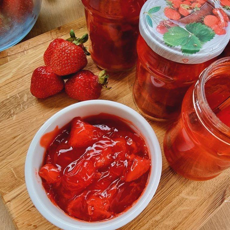A fruzselina rövid ideig főzött eper, cukorral és egy kis keményítővel, ami remekül használható desszertekhez, süteményekhez vagy palacsintákhoz. Annyira finom, hogy akár egyenesen az üvegből is lehet kanalazni. Különösen ajánlom, amíg tart az eper szezonja!