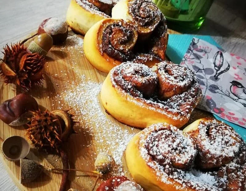 Estére nutellás szívek készültek, bár csaltam egy kicsit, mert már nem volt kedvem a tésztáját begyúrni és még kivárni, hogy meg is keljen… szóval bolti kelt tésztát megkentem nutellával, mindkét hosszabbik felét a tészta közepéig feltekertem, majd szív alakúra formáltam. Sütőpapírral bélelt tepsibe (egymástól kicsit távolabb) helyeztem őket. A sütőt közvetlen akkor kell beindítani, mikor beraktuk a tepsit, mert így jobban meg tudnak kelni, mintha már előmelegítettbe tennénk. 180°-on 15 perc alatt megsütjük. Langyosan a legfinomabb pici porcukorral meghintve.