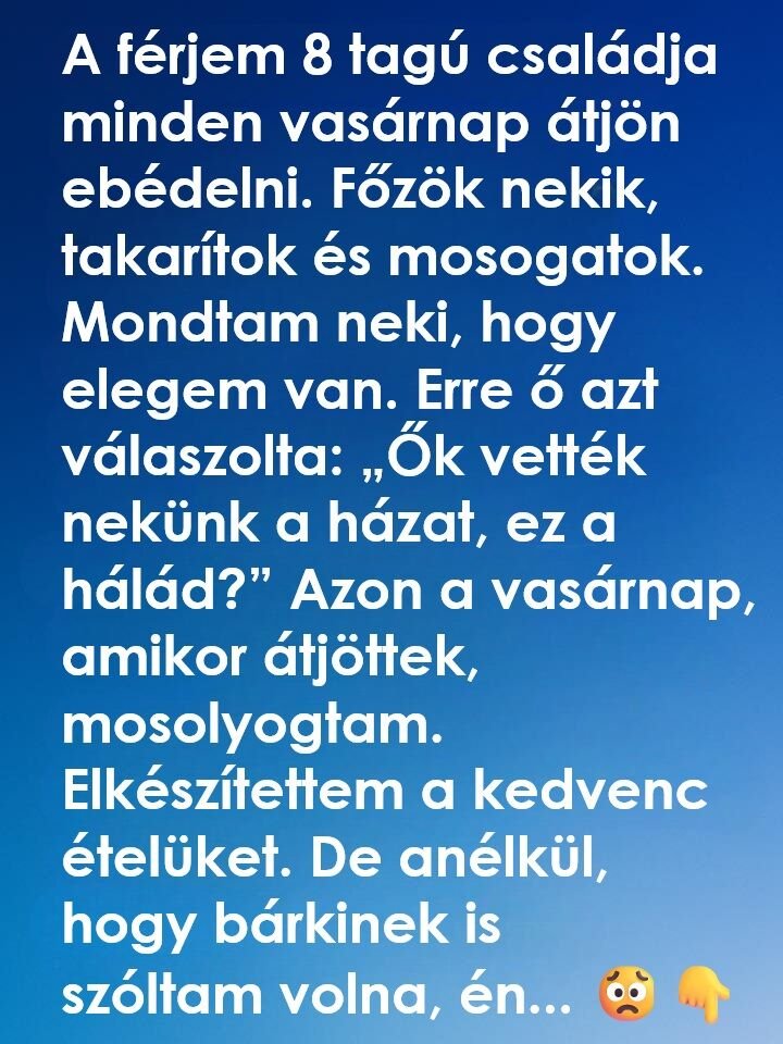 A vasárnapjaim egyformák voltak, hosszúak és kimerítőek. Korán keltem, intéztem a házimunkát, és mindig azt ígértem magamnak, hogy egyszer tényleg pihenek. Az élet viszont gyakran akkor tanít, amikor nem számítasz rá. Minden vasárnap jött a férjem nyolcfős családja ebédre. Főztem, takarítottam, mosolyogtam, és próbáltam kézben tartani mindent.