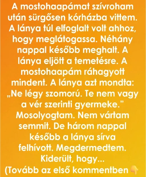 Egy hideg, csöndes hajnalon vittem be a mostohaapámat a sürgősségire. Az a fajta hajnal, amikor a csend már gyanúsan nehéz, csak még nem tudod, miért. Otthon szívrohamot kapott, a mellkasát fogta, és csak ismételgette, hogy „jól van”, miközben patakokban folyt róla a víz. Nem vitatkoztam vele – egyszerűen felvettük a kulcsot, és elindultunk a kórház felé.