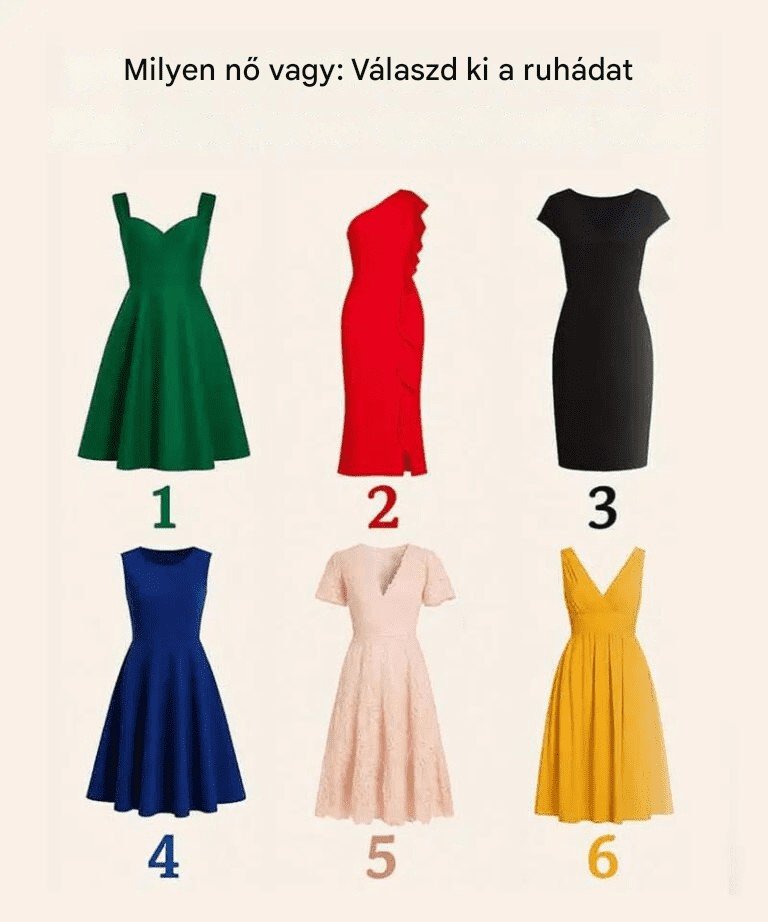 A divat nem csak az anyagokról és a színekről szól – hanem a személyiség, az önbizalom és a belső energia tükröződése is. A ruha, amihez természetes módon vonzódsz, sokat elárul arról, hogy ki vagy, hogyan állsz hozzá az élethez, és milyen aurát hordozol. Szánj egy pillanatot, nézd meg a képen látható hat ruhát, és válaszd ki azt, amelyiket a legszívesebben viselnél.