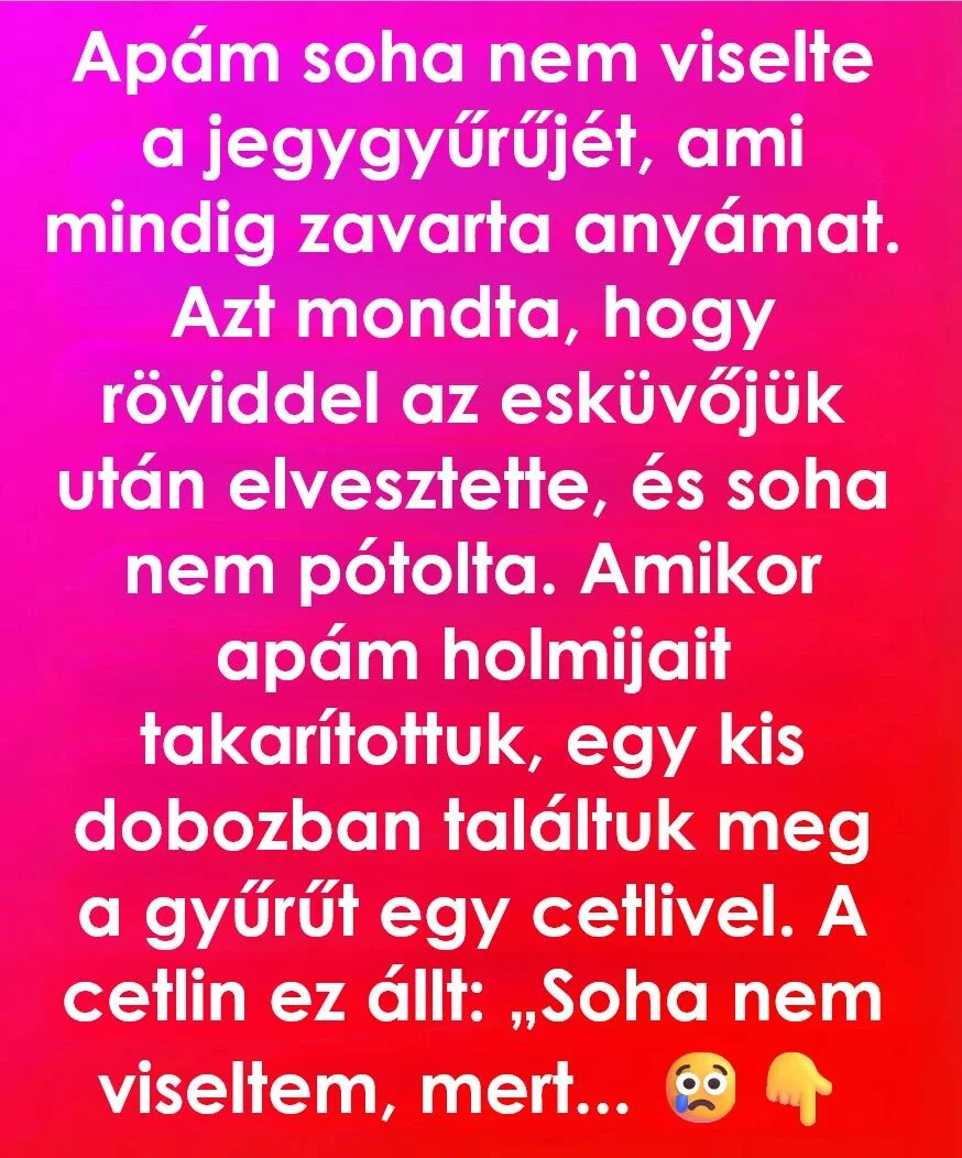 A valóság sokkal kedvesebb volt, mint bármi, amit elképzeltünk. Apukám egész életében kétkezi munkát végzett, motorokat javított, fát pakolt, kerítést szerelt. A keze folyton sebes volt, horzsolásokkal, vízhólyagokkal teli. Félt, hogy a gyűrű beleakad valamibe, megsérül, vagy egyszerűen leesik róla munka közben. Ezért inkább elrakta, hogy biztonságban legyen.