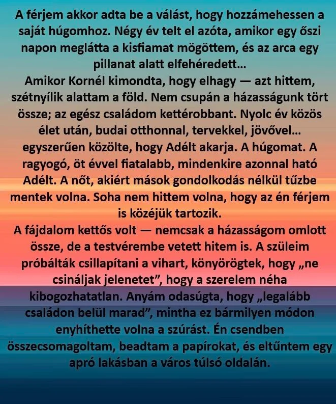 Esténként együtt főztünk – vagyis én főztem, ő a háttérben zenét keresgélt, majd dicsérte a levesemet, mintha legalább egy étteremkritikus lennék. A vasárnapi szokásaink is úgy tapadtak hozzánk, mint a régi házak illata: minden hétvégén vettünk egy grillcsirkét a piacról, és három napig abból éltünk. „Okos házasok így spórolnak” – mondta mindig Kornél, és én elhittem neki, mert akkoriban mindenben hittem neki.