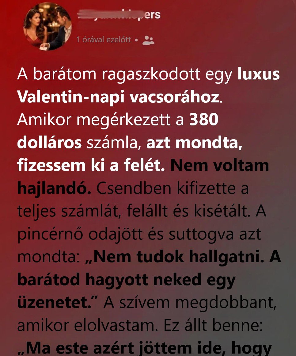 Aznap este a párom meglepett egy asztalfoglalással a város egyik legelegánsabb éttermében. Nem a mi stílusunk volt. Halk hegedűszólt a háttérben, a gyertyák fénye táncolt a hófehér abroszokon, a kristálypoharak pedig úgy csillogtak, mintha apró fények lennének.