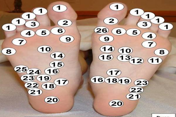 1. arcüreg 2. nyak 3. légcső 4. fül 5. szem 6. hangszálak 7. tüdő 8. váll 9. pajzsmirigy 10. rekeszizom 11. szív 12. lép 13. hasnyálmirigy 14. mellékvese 15. vese 16. keresztirányú vastagbél 17. hólyag 18. vékonybél 19. leszálló vastagbél 20. ülőideg 21. térd 22. comb 23. csípő 24. epehólyag 25. máj 26. gyomor