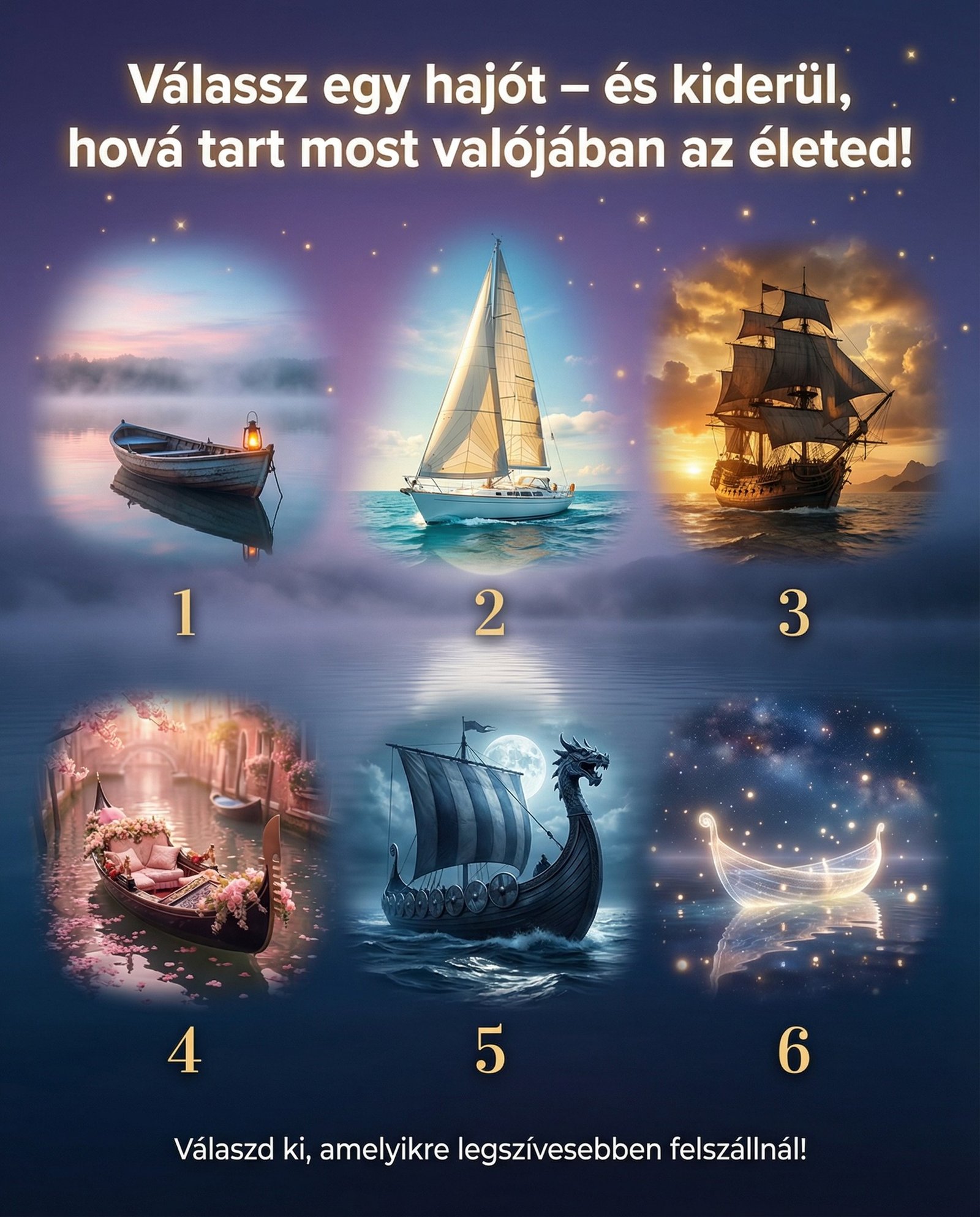 Nézd meg a hat hajót, és válaszd ki azt, amelyikre legszívesebben felszállnál. Amelyikre ránéztél, és érezted: ezzel mennék. Ez a hajó a tiéd – és az irány, amerre tart, az a te életed iránya most. Görgess lejjebb, és olvasd el, hová visz!