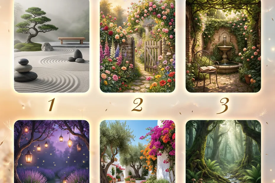 Nézd meg a hat kertet, és válaszd ki azt, amelyikben legszívesebben megpihennél. Ahol ránéztél, és érezted: itt jó lenne leülni, mélyet lélegezni, és egyszerűen csak lenni. Ez a kert a tiéd. Görgess lejjebb, és olvasd el, mit kellene elengedned ahhoz, hogy végre boldog legyél!
