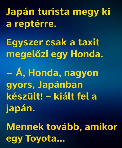 – Micsoda? Az nagyon sok – hápog a japán.– Taxióra, nagyon gyors, Magyarországon készült! – válaszolja a sofőr.